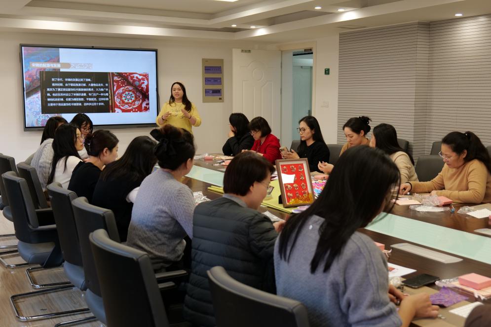 活动伊始,特邀非遗手工艺老师为大家讲解了宋锦的历史渊源、工艺特点及文化寓意。宋锦作为中国传统的丝制工艺品,色泽华丽、图案精美,2006年被列入第一批国家级非物质文化遗产名录。老师们听得津津有味,对这一古老技艺产生了浓厚的兴趣。