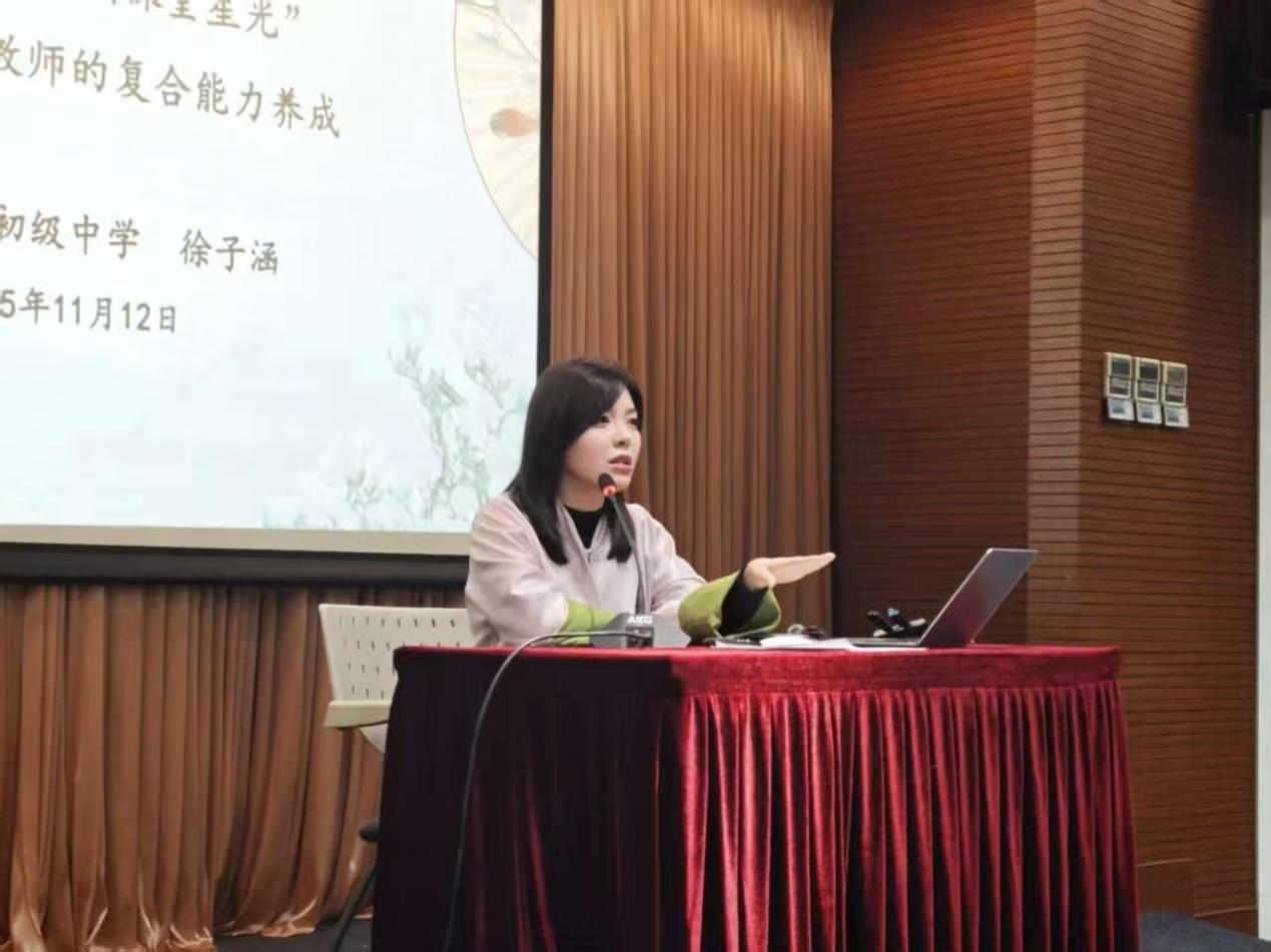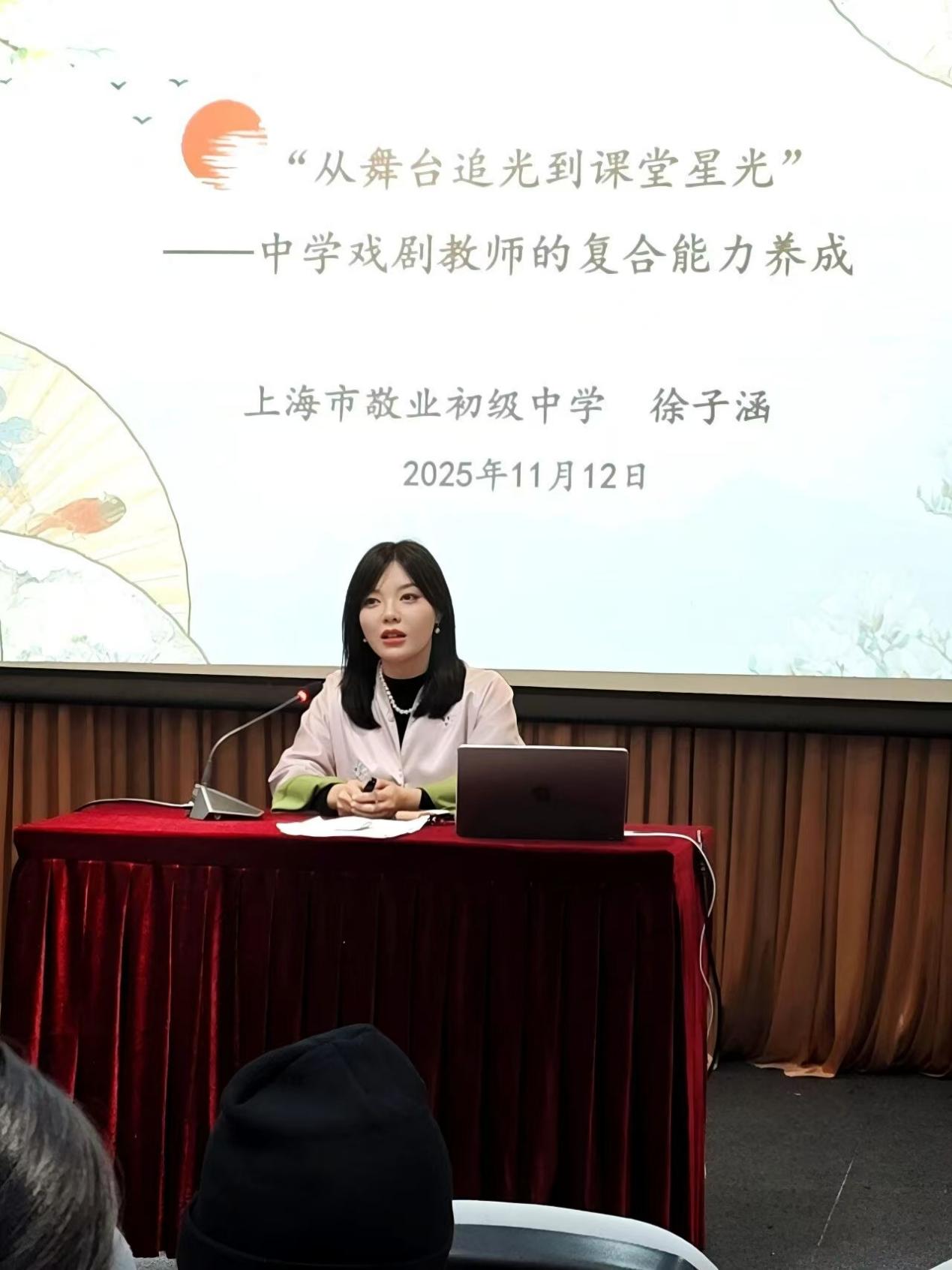 2025年11月12日下午,表演(师范)专业在徐汇校区成功举办教师教育系列讲座。本次讲座特邀上海市敬业初级中学校务管理部副主任、艺术教师徐子涵担任主讲,以《从舞台追光到课堂星光:中学戏剧教师的复合能力养成》为题,与师生分享了来自戏剧教育一线的实践探索与职业成长经验。