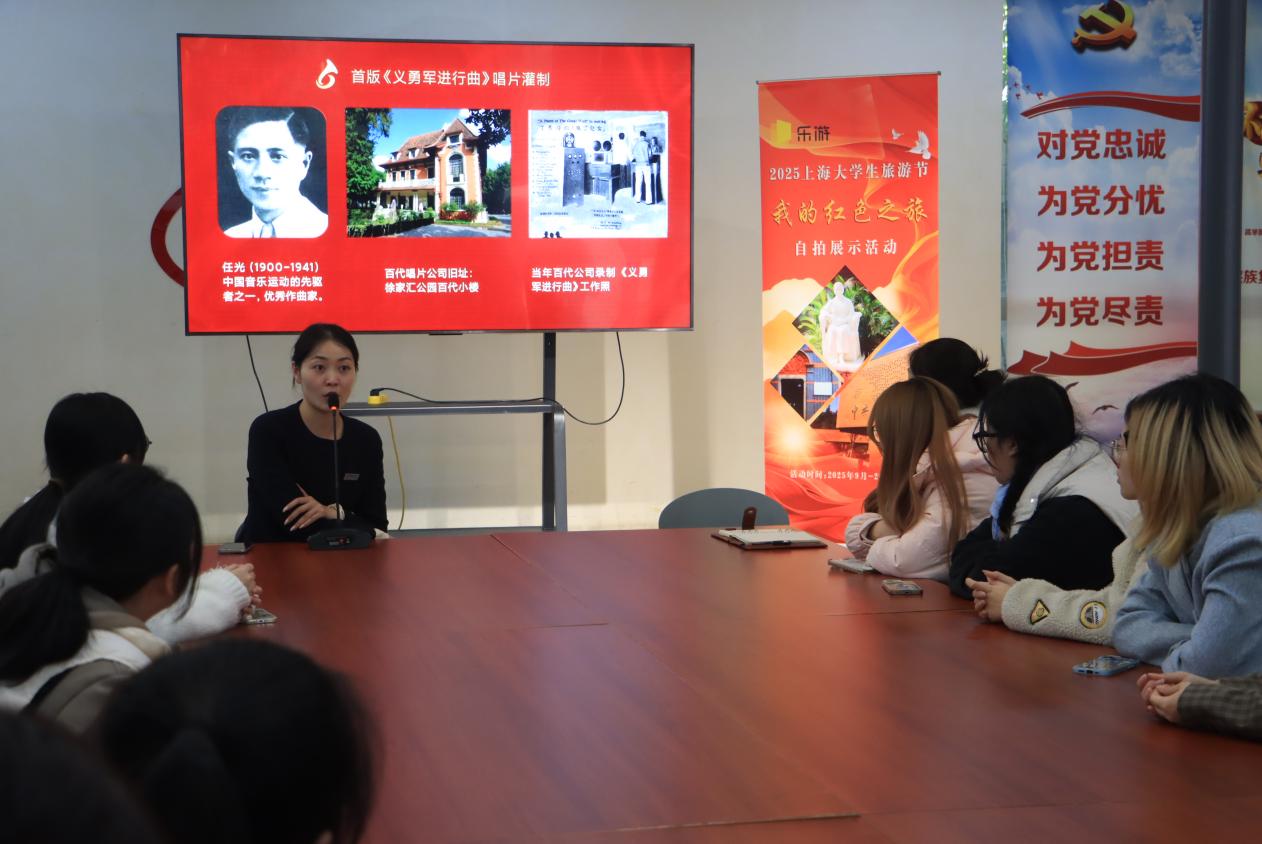 11月19日下午,影视传媒学院与上海电视台乐游频道联动,在东九思享屋开展“国歌故事进校园”讲座分享,本次讲座面向学院全体发展对象,主讲人为上海国歌展示馆宣教部讲解员李梦孟。