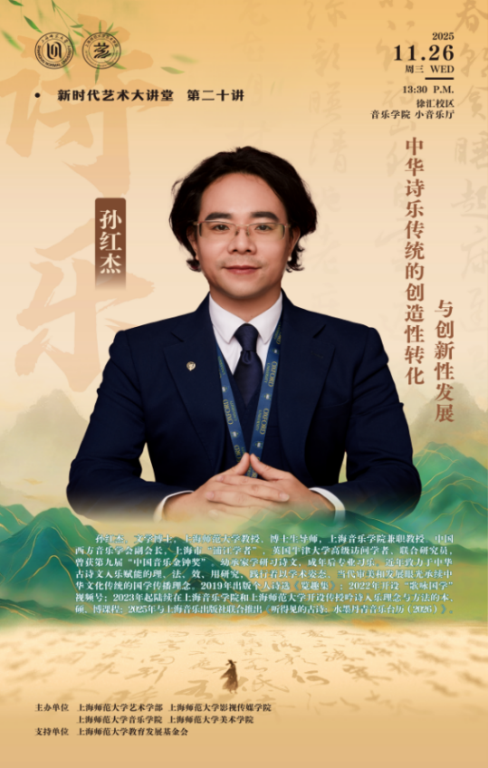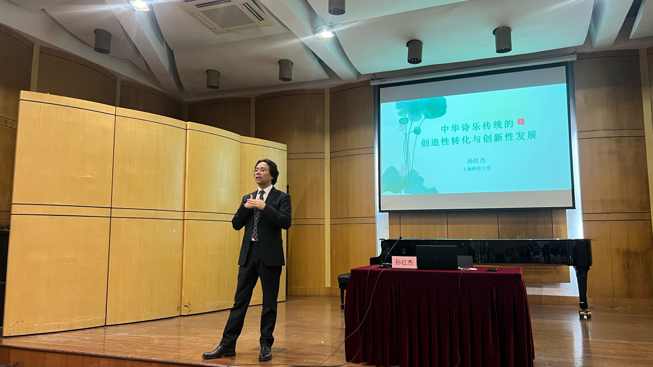 2025年11月26日,上海师范大学徐汇校区音乐学院小音乐厅迎来“新时代艺术大讲堂”第二十讲。本次讲座主讲人是上海师范大学教授、博士生导师孙红杰先生,他以“中华诗乐传统的创造性转化与创新性发展”为题,结合自身在古诗词音乐创作、表演以及传播方面的经验,探讨了中华诗乐传统的现代化转型路径与发展策略。我校音乐学院本科生、研究生及艺术学部博士生到场聆听,现场学术气氛热烈。