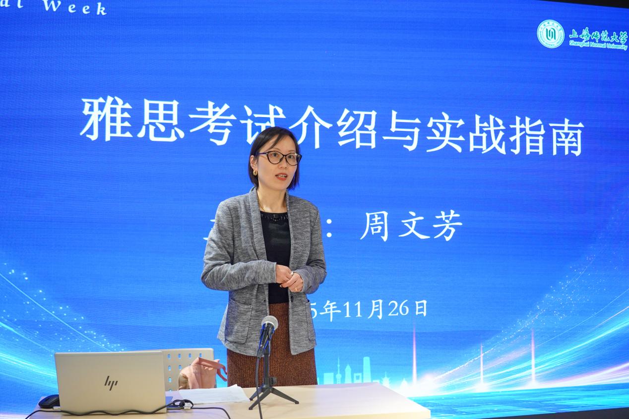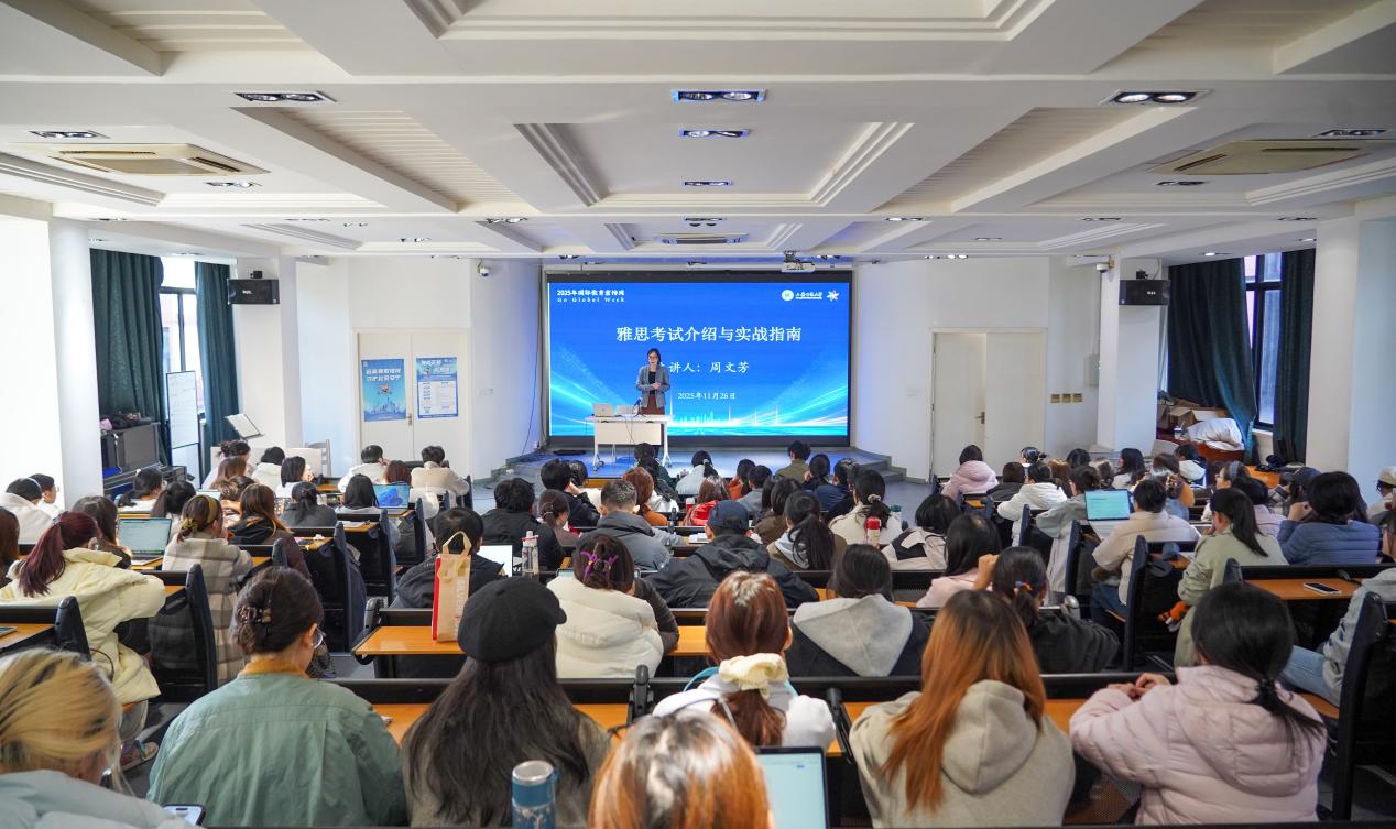 为开拓学生国际视野,营造国际化办学氛围,2025年11月26日14:30-16:00,上海师范大学“国际视野·启航未来”国际交流教育宣传周系列“雅思考试介绍与实战指南”专题讲座在徐汇校区四教B201教室成功举行。本次活动由我校影视传媒学院与外国语学院共同协办,吸引了我校近200名有志于开阔国际视野,了解雅思考试的同学参加,现场座无虚席。
