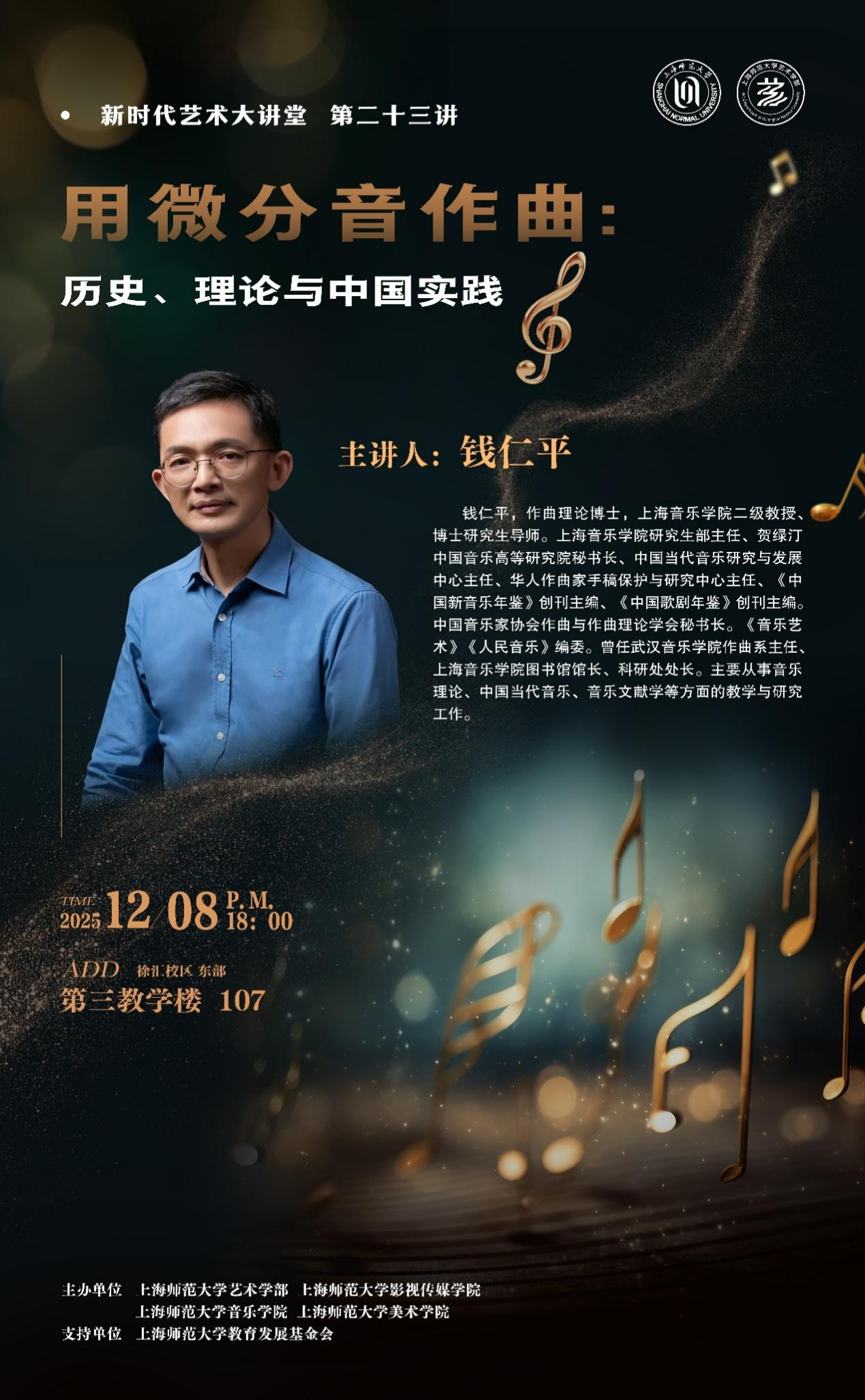 2025年12月8日晚,上海师范大学徐汇校区艺术学部联合音乐学院在第三教学楼107教室举办“新时代艺术大讲堂”第23讲。本次讲座特邀著名音乐理论家、上海音乐学院教授、博士生导师钱仁平先生以题为“用微分音作曲:历史、理论与中国实践”来演讲。艺术学部主任朱恒夫教授、音乐学院院长施忠教授以及60多名音乐学院师生、艺术学部博士生等到场聆听。