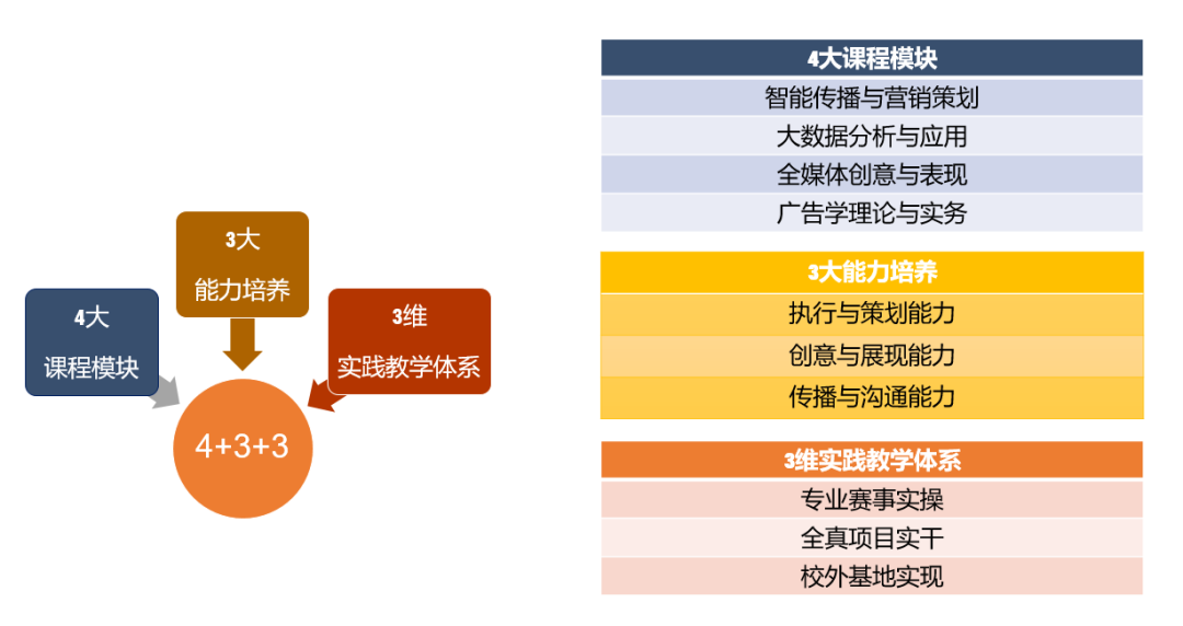 广告学专业在广告创意传播人才培养方面成就显著,充分把握广告教育中的确定性,适应广告媒介中的新变化,提升广告产业的技术效应,以“创意实践驱动”为核心理念,实现课程设置的“四三三模式”,夯实教学方式“赛事教学+项目教学”两大抓手,构建“产学研政”教学平台。